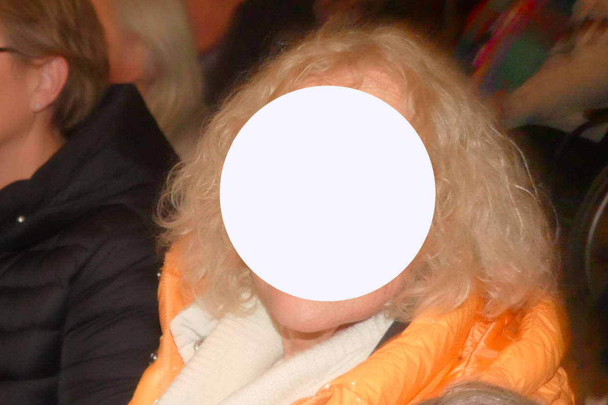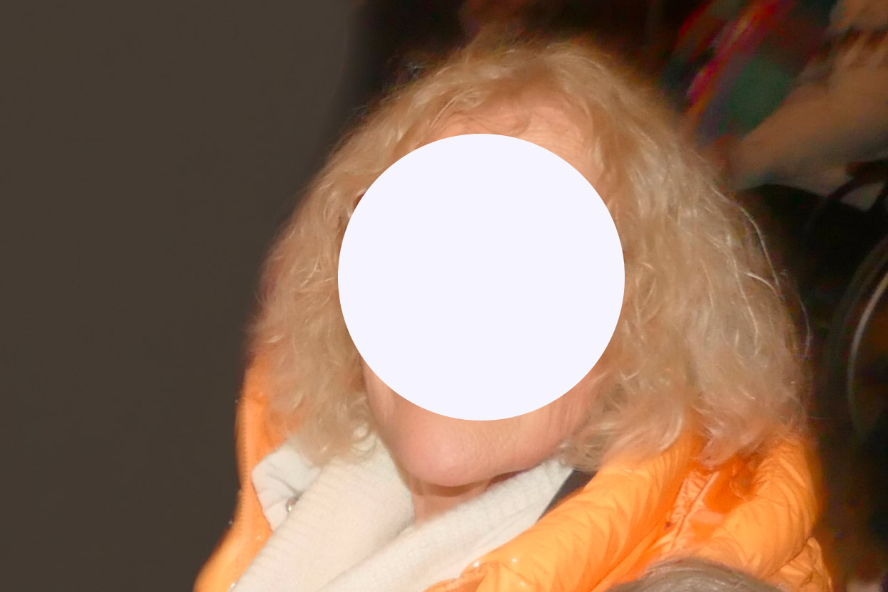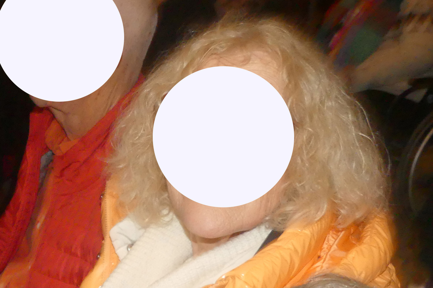 La personne de droite (dont le visage est flouté sur la version envoyée) a des cheveux blonds et bouclés, et porte une veste orange clair avec une écharpe crème.